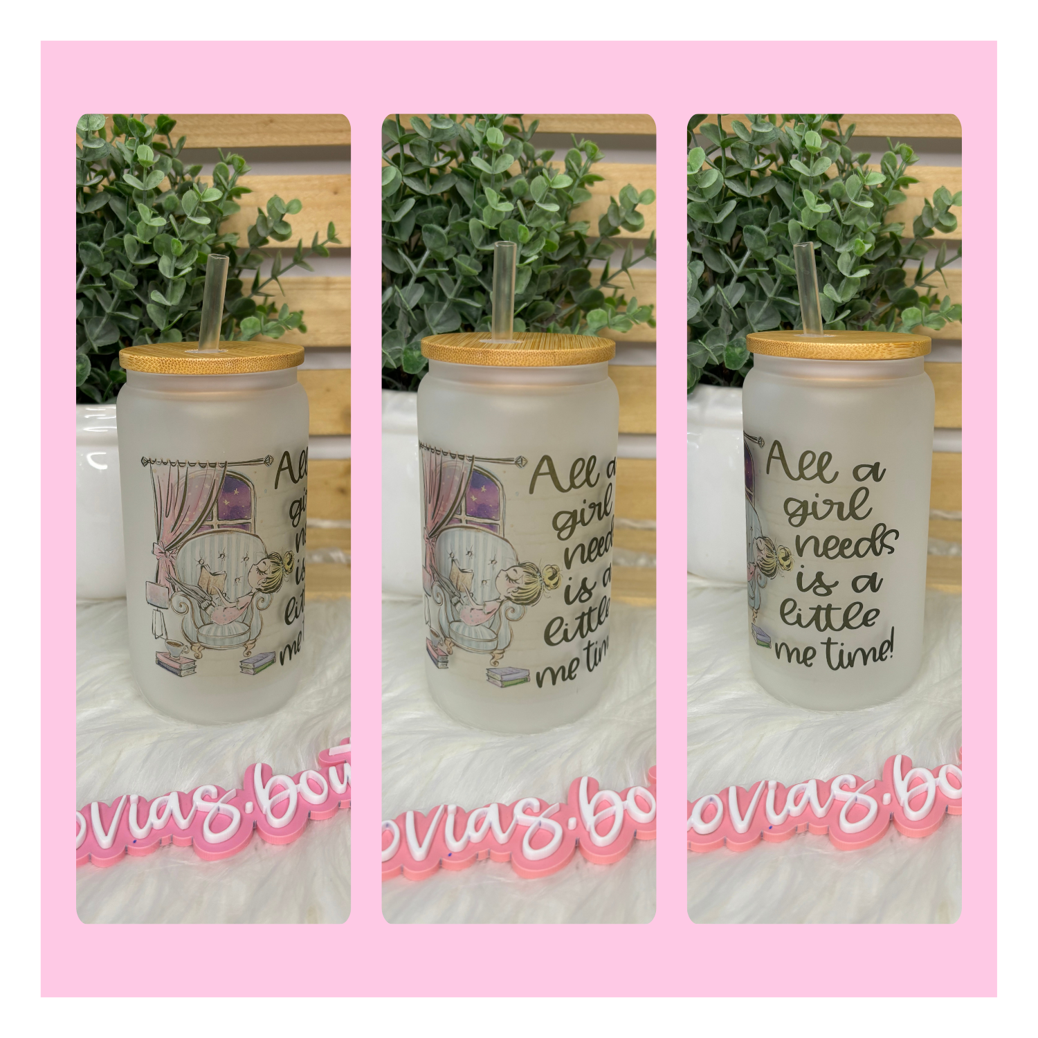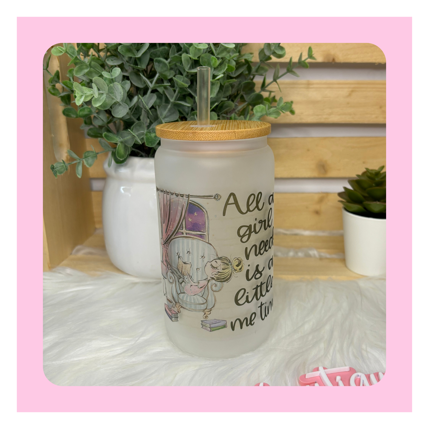 - Frosted Glass Tumbler with Bamboo lid and plastic clear straw.