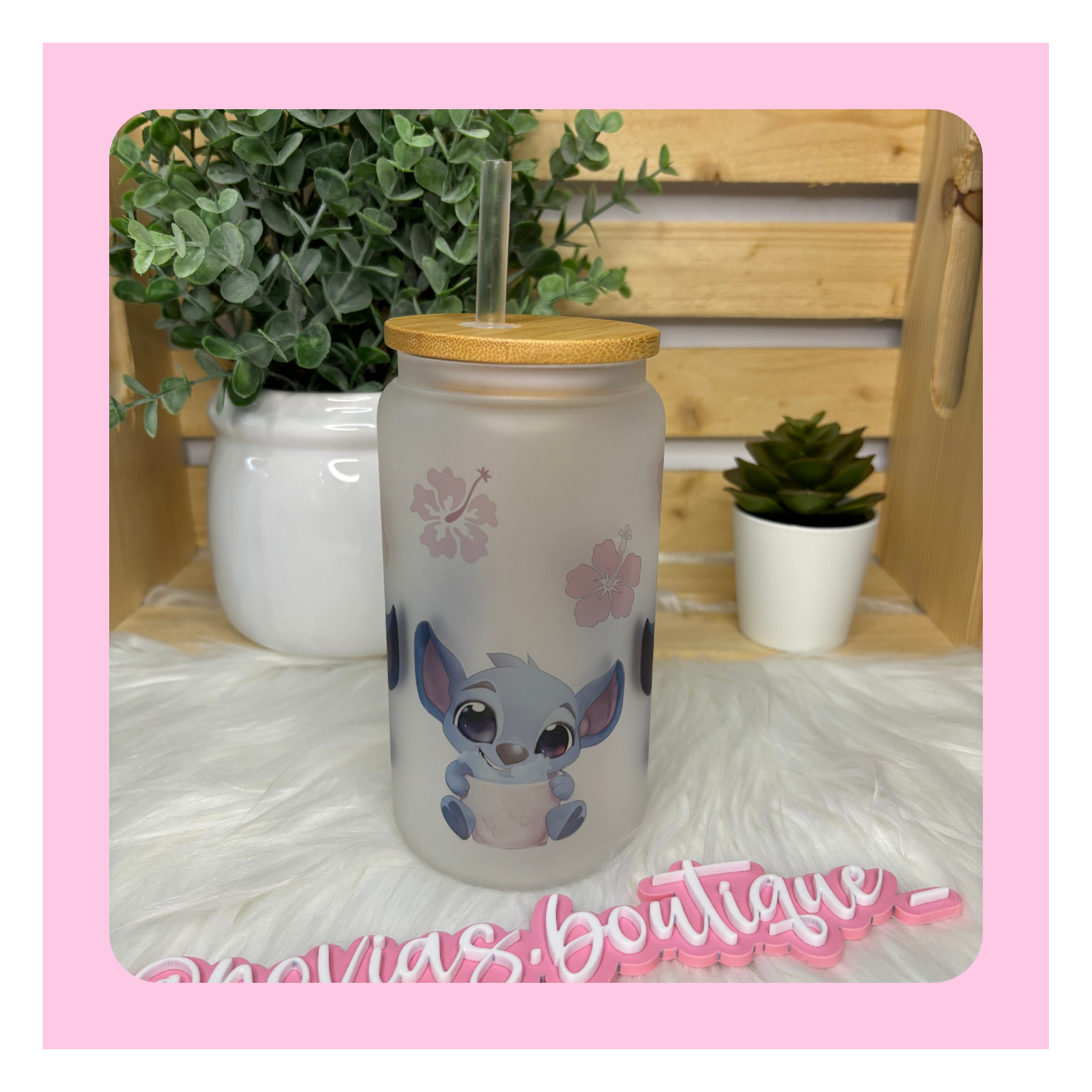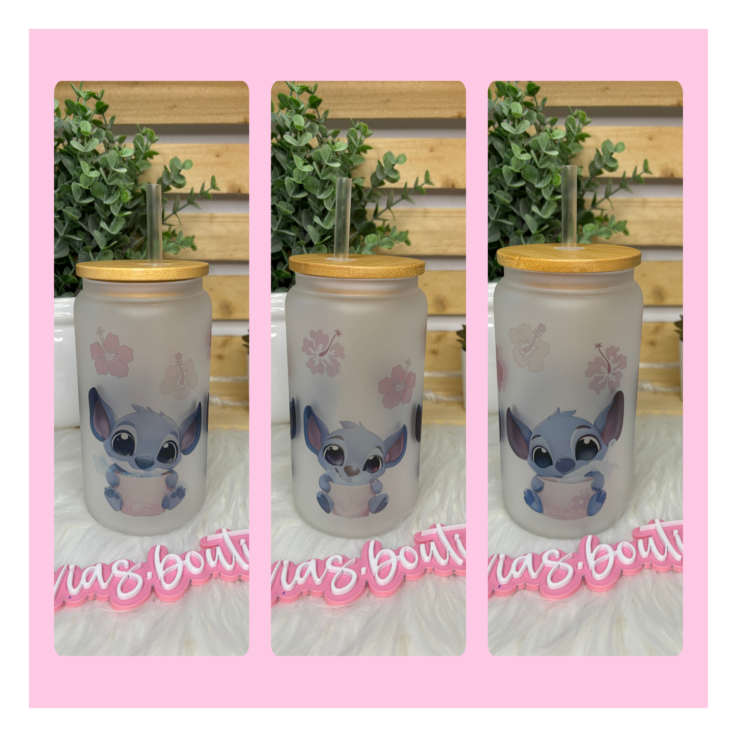 • Frosted Glass Tumbler with Bamboo lid and plastic clear straw.
