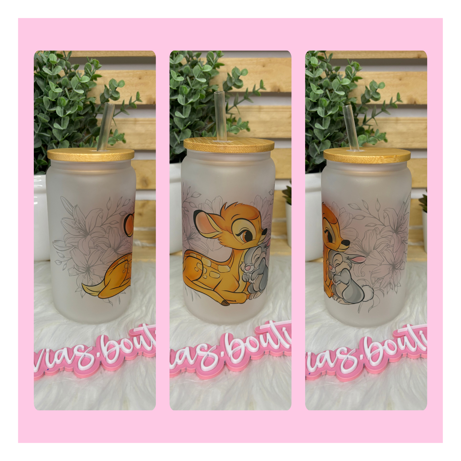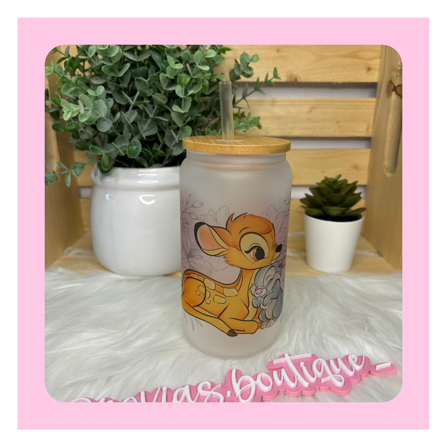 - Frosted Glass Tumbler with Bamboo lid and plastic clear straw.