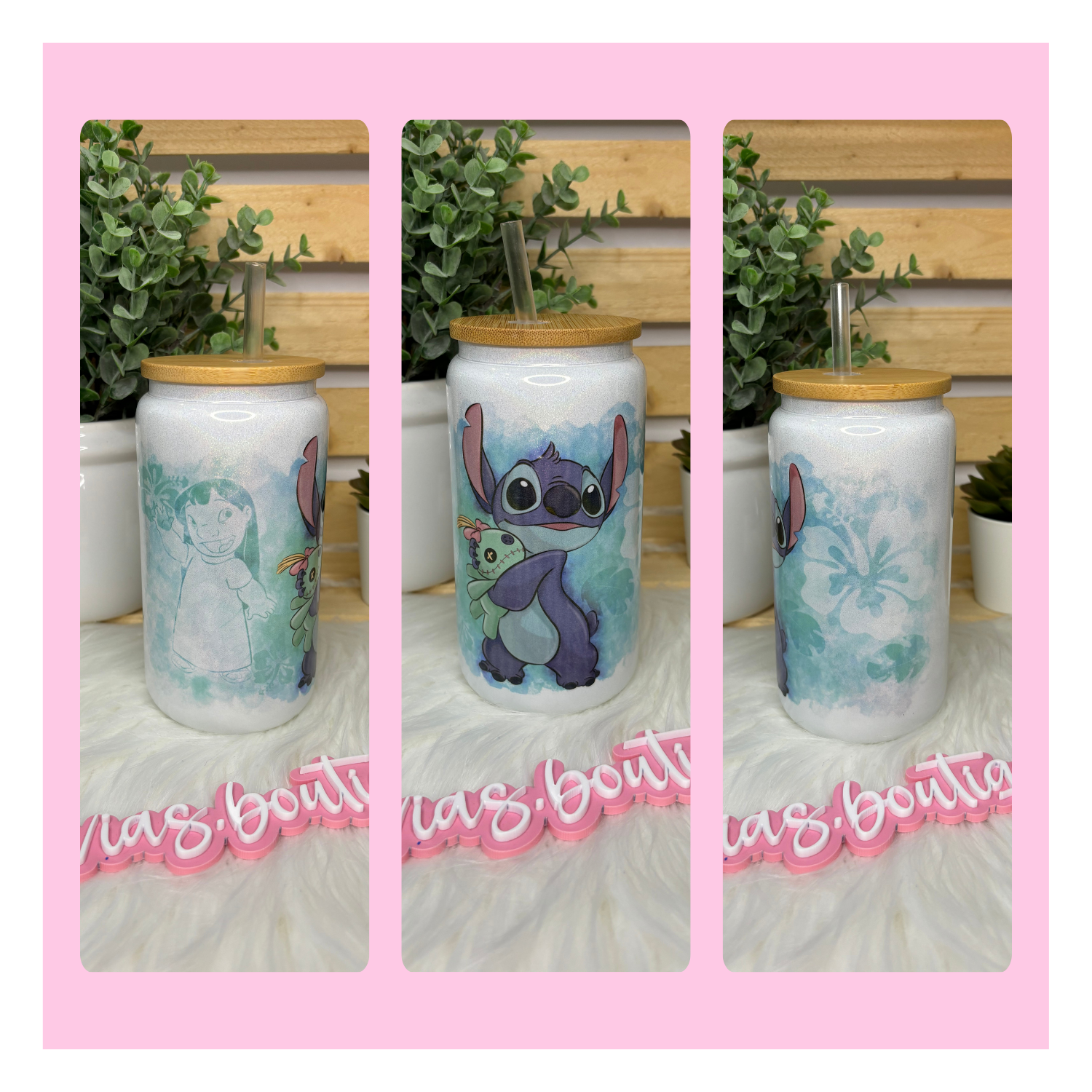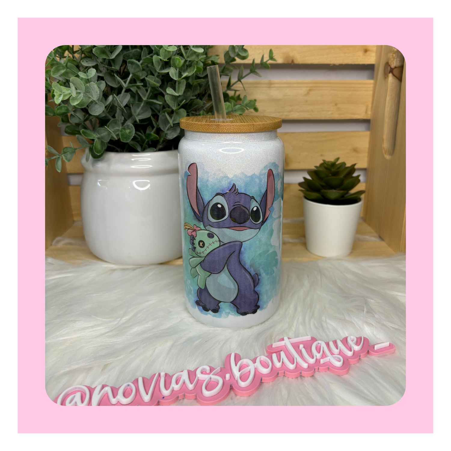 - White Shimmer Glass with Bamboo lid and plastic clear straw.