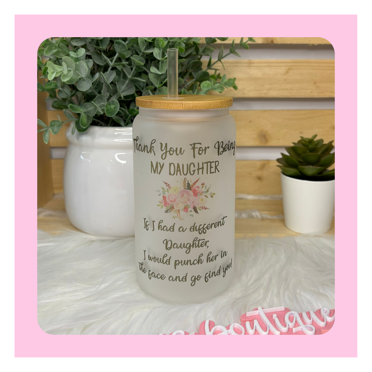 • Frosted Glass Tumbler with Bamboo lid and plastic clear straw.