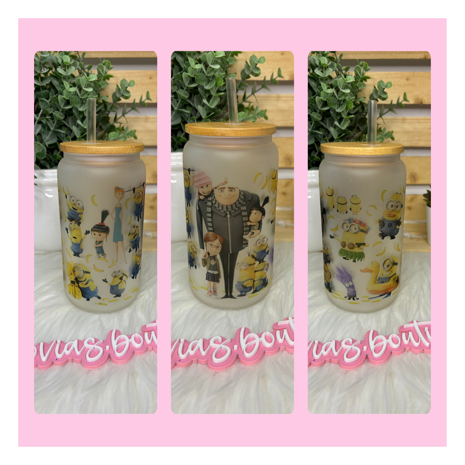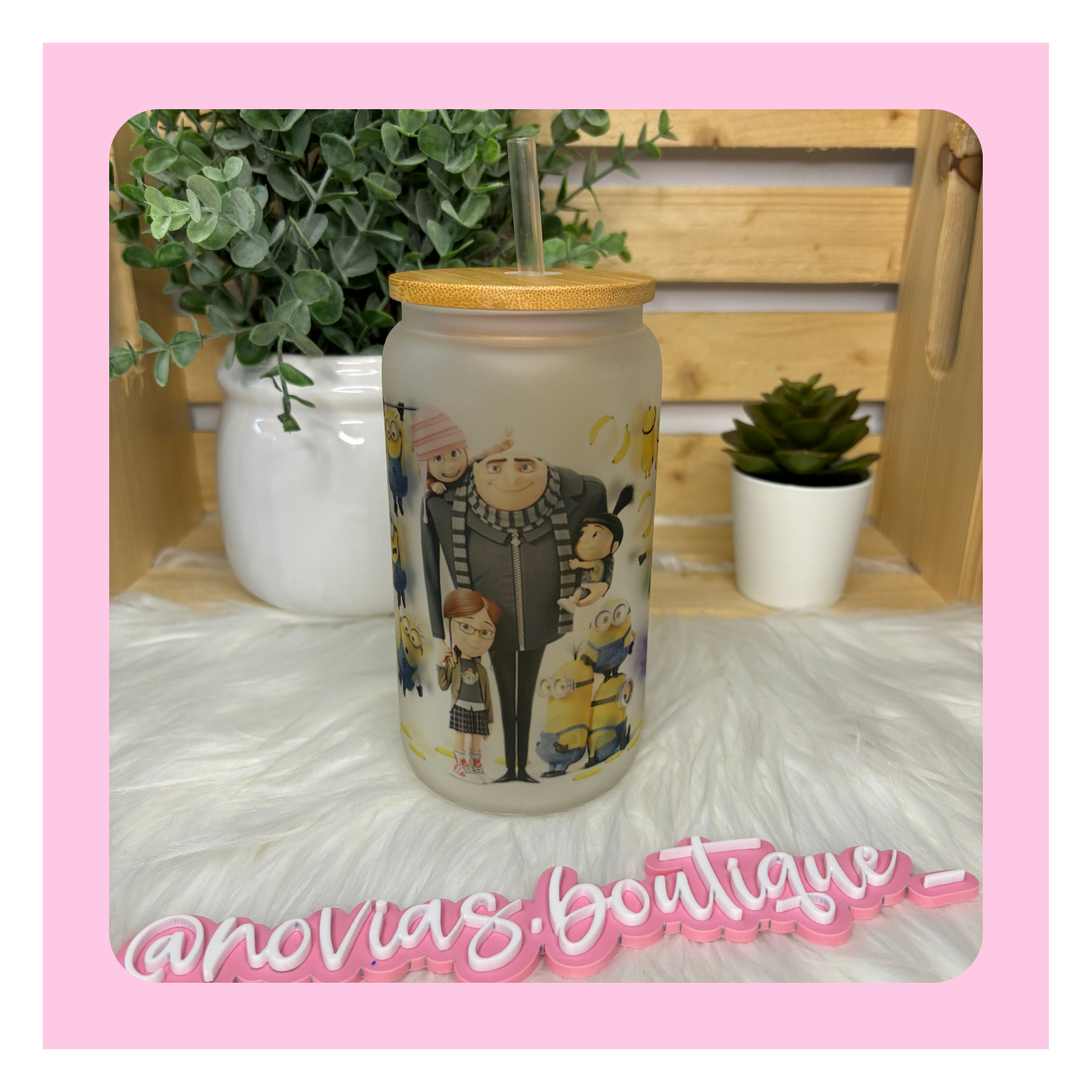 • Frosted Glass Tumbler with Bamboo lid and plastic clear straw.